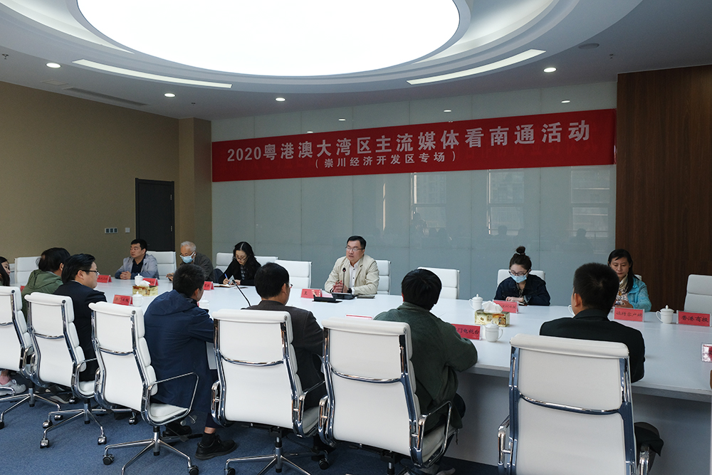 崇川經濟開發區黨工委副書記王晶(上排左四)向2020粵港澳大灣區主流媒體一行介紹崇川經開區產業發展情況和招商政策