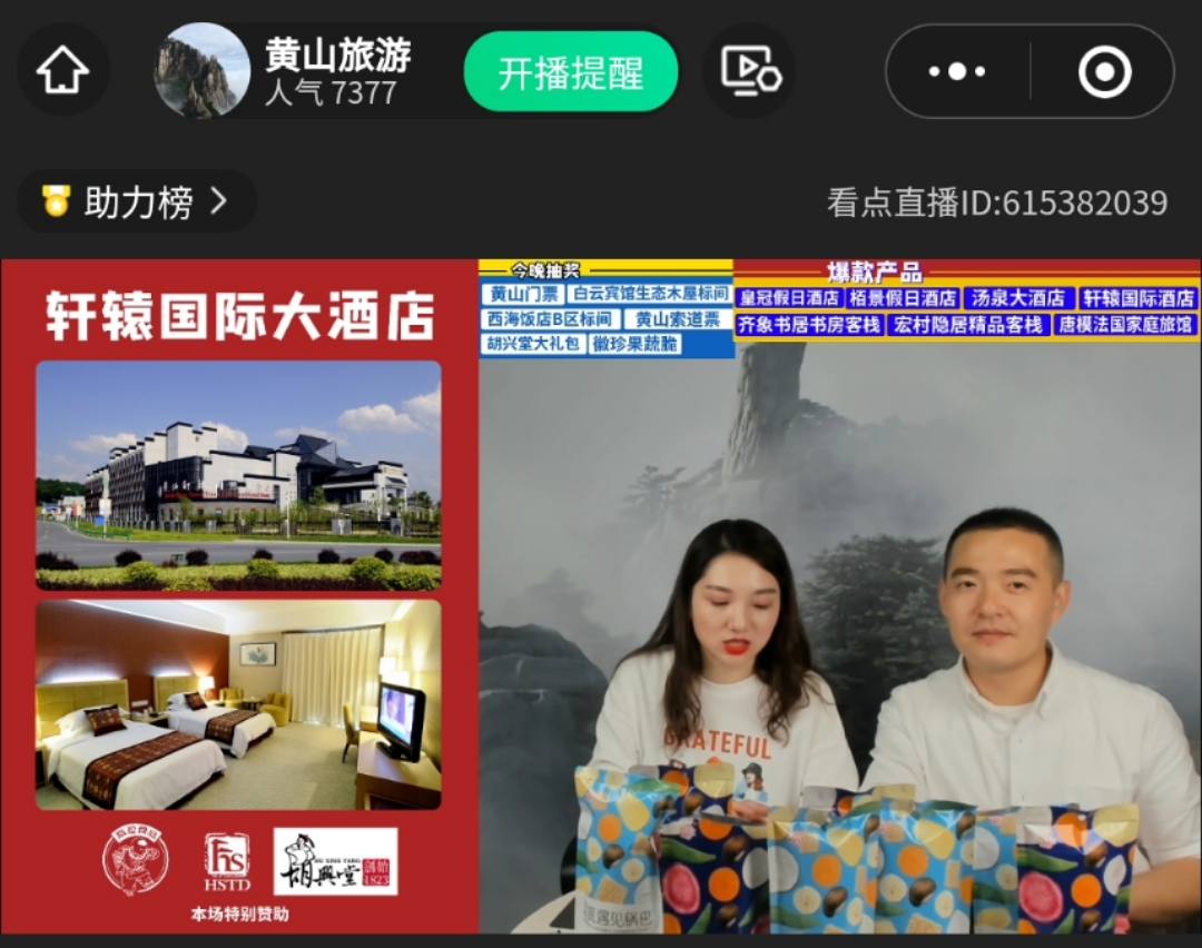 據介紹,此次直播時長3個多小時,黃山智慧旅遊有限公司(以下簡稱“智慧旅遊公司”)克服場地空間小、直播經驗不足,人手少、時間長等不利因素,堅持“品效合一”的理念,認真籌備、有序推進。首場直播主題“美宿狂歡節”,直播內容包含黃山旅遊旗下酒店產品在內的14家酒店或民宿產品,以及4種黃山特產,線上成交額突破2萬元。從“新安江水碧悠悠,攬入屯溪橋下夢”的昱城皇冠假日酒店到接待過諸多政要名流的西海飯店,從網紅民宿微印象主題客棧到爆款徽菜胡興堂落花流水臭鱖魚,主播在直播中將黃山市的美景、美食、美宿、美物充分展現在了網友面前,順利完成首播。