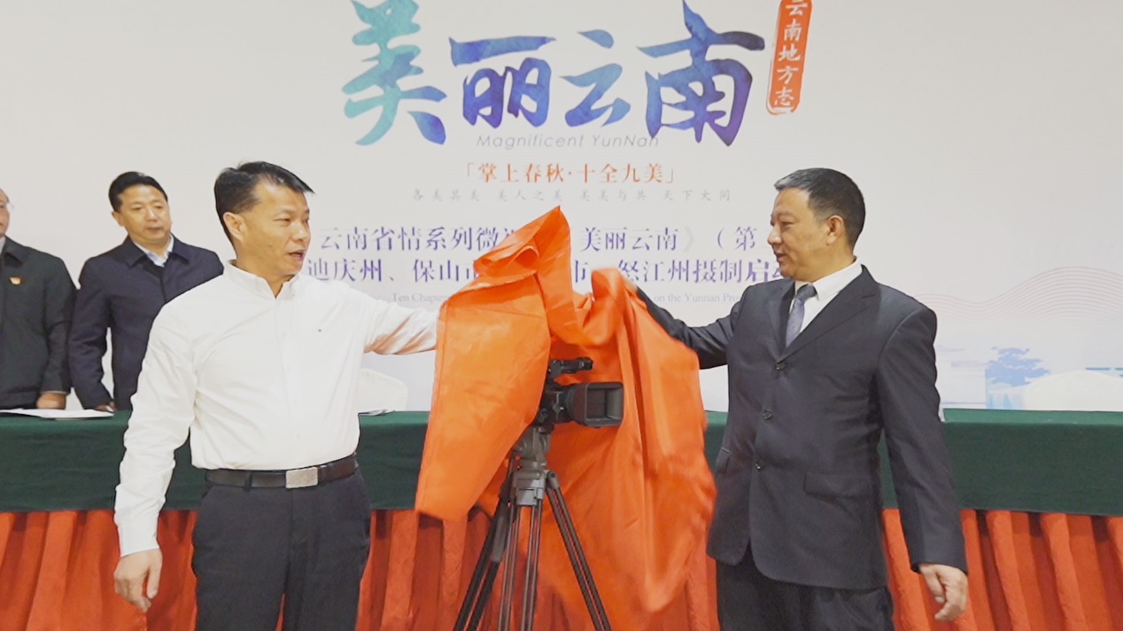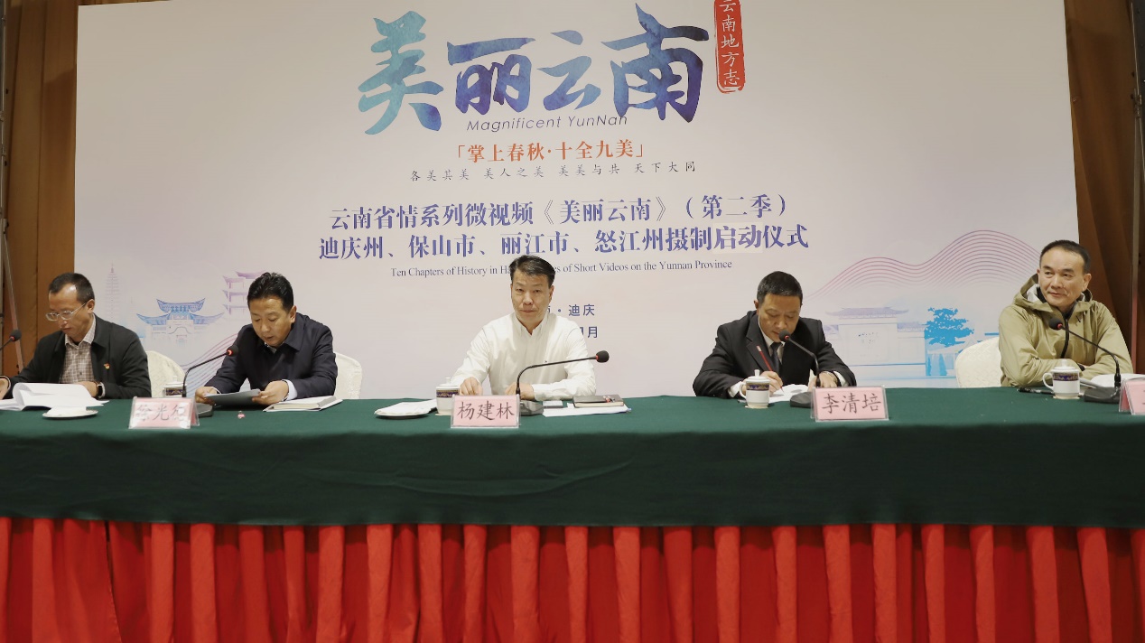 雲南省地方志編纂委員會專職副主任、辦公室主任楊建林宣佈「迪慶、麗江、保山、怒江省情系列微視頻《美麗雲南》(第二季)全面啟動」,並與迪慶州人民政府副州長、州交通運輸局局長李清培共同為拍攝設備進行開機揭幕。