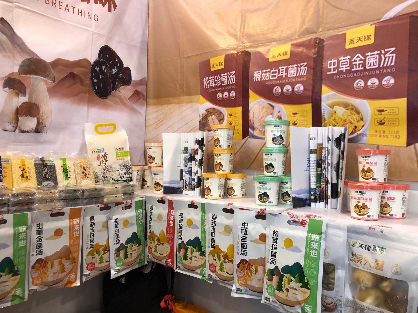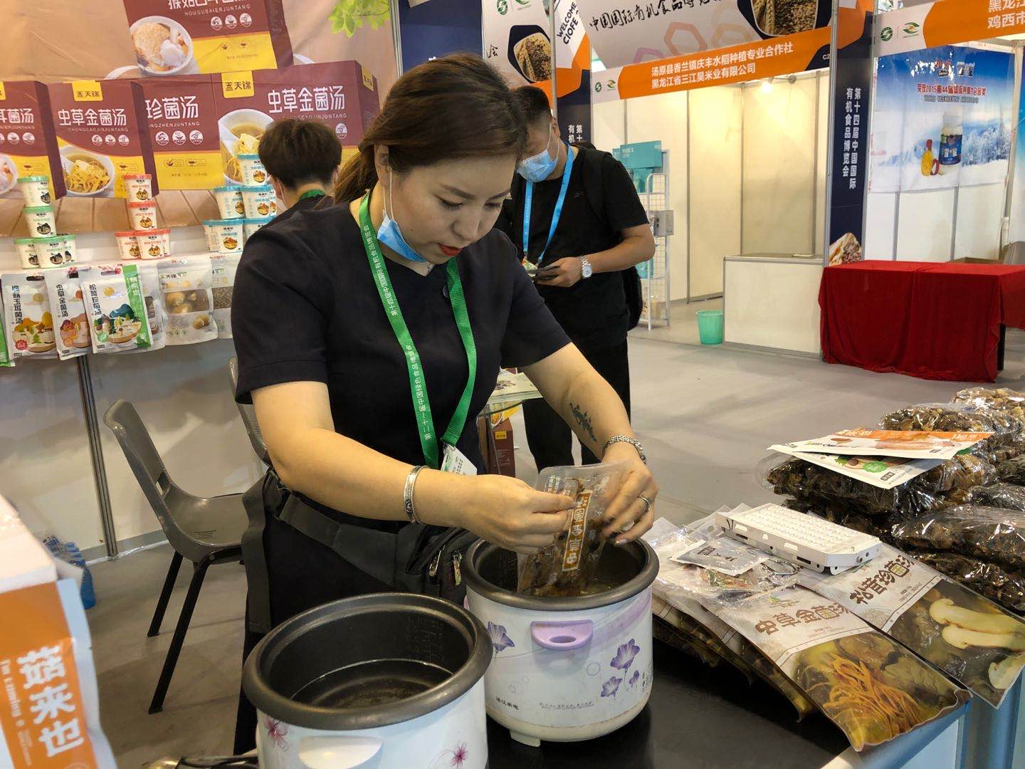 記者來到黑龍江有機食品展區黑龍江天錦食用菌有限公司展位前,參展人員正拿出一袋松茸珍菌湯,邊撕開包裝邊介紹到,「裏面是按比例調配好的,水燒開將每包食材與調料分別放進去,三分鐘就可以品嘗到健康美味的食用菌湯。」記者在與參展人員了解產品時,湯燒得滾熱,隔着口罩,菌類獨有的香氣緩緩鑽進鼻子裏,盛一杯品嘗,菌香四溢繞齒間,不少「聞香」而來的遊客品嘗後立即購買。