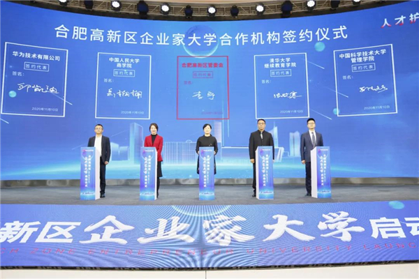 合肥高新區與清華大學繼續教育學院、中國人民大學商學院、中國科技大學管理學院、華為技術有限公司簽訂合作協議(圖片來源:合肥高新發佈)
