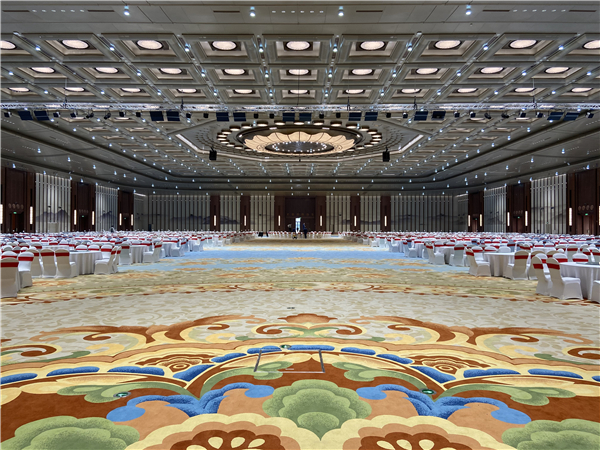 地面上鋪設的花團錦簇的進口手工織羊毛地毯與天花芙蓉國里盡朝暉之主題遙相呼應。同時,整個芙蓉廳也可以根據需求巧妙「變換」,可將整個會場分為3個2600㎡的單獨場地,靈活又多用。