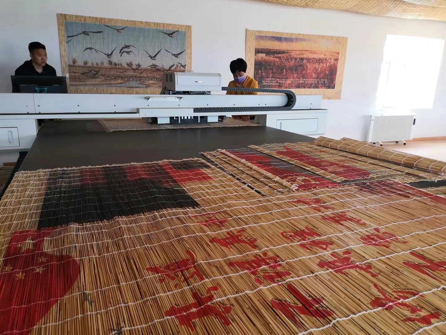 一手穩外貿,一手拓展國內市場。在產業園葦簾展示大廳里看到,各式各樣的葦簾樣品掛滿了展廳的牆。一台智能噴繪機正在工作,不到半個鐘頭,丹頂鶴翩翩起舞的畫面在葦簾上鮮活呈現。