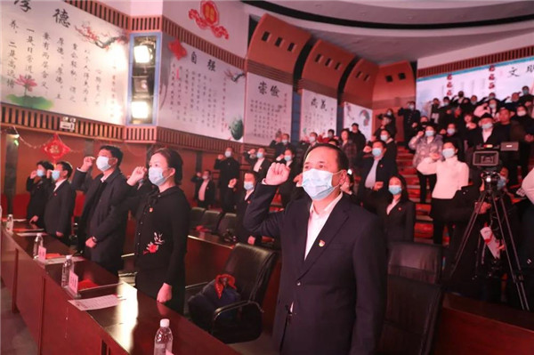「我志願加入中國共產黨」,堅定的誓言縈繞在每位共產黨員的心中,全體黨員面向黨旗,舉起右手,再憶初心,重溫信念,黨課就此拉開序幕。