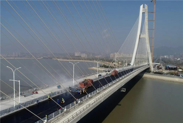 在現場了解到,橋面鋪裝首先進行防水層處理,然後選取澆築式瀝青混凝土和SMA改性瀝青混凝土兩種材質,溫度達到230攝氏度,分上下兩層鋪裝,總厚度達到8厘米,其中上層瀝青攤鋪厚度為4.5厘米。不僅空隙率極小,無需碾壓便能達到其最終強度,不會出現因壓實不足而表現出的缺陷病害。