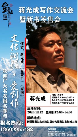 近日,記者從烏魯木齊匯嘉時代星聚匯書影城獲悉,2020年12月12日星期日12:00-14:00,主題為文化潤疆·愛創作,蔣光成寫作交流暨新書籤售會將在新疆星聚匯北京路匯嘉時代星聚匯書影城三樓舉行。