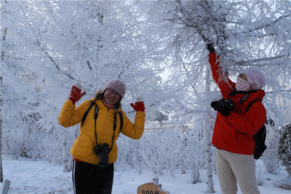 回到故鄉的返鄉遊客黃如新開心的說,「好幾年沒回咱們呼瑪了,回到呼瑪一看這美景,特漂亮,特別是這個霧凇,掛樹上白白的,像雪花可美了,今天沒啥事,領着我嬸和我叔出來到江邊看一看。」