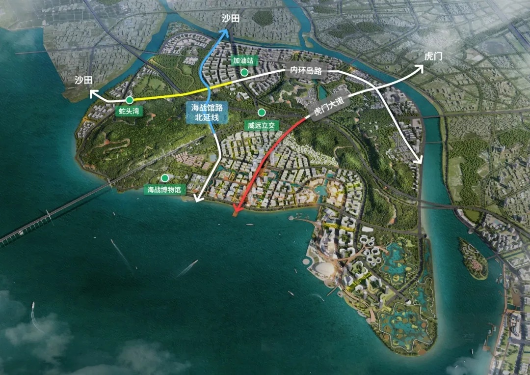 據悉,目前濱海灣新區海戰館路北延線市政工程、內環島路(西段)提升改造工程、虎門大道南延線市政工程已完成勘察設計招標。其中投資4.38億元的海戰館路北延線位於威遠島西側,採用城市主幹路設計標準,全線長2.72公里,呈南北走向,依次與內環島路、天培路相交,終點與外環島路相交。未來,海戰館路的南北兩頭,都與外環島路相接。