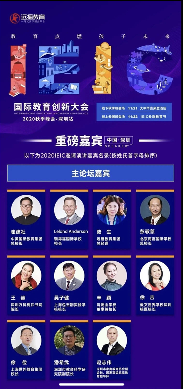 深圳市教育科學研究院副院長,北京海嘉總校長、上海包玉剛校長、愛文深圳校長、上海世外校長等全國各大名校校長,國家高級家庭教育指導師,專注於移民留學的專家都將出席今年IEIC國際教育創新大會·深圳站,他們將多層次多角度探討國際教育,共話孩子的未來。