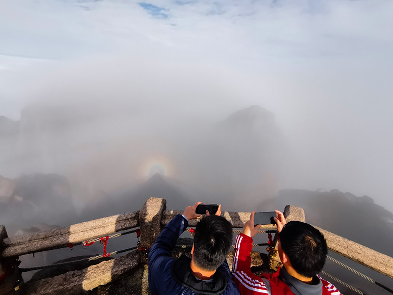 11月24日上午八點多,登山遊客在黃山光明頂、群峰嶺、蓮花峰、始信峰、臥雲峰附近都看到“佛光”,遠遠望去如同佛像頭上的光圈,這神奇的景象令來往遊客驚喜難忘,大家紛紛拿出手機拍下這精彩的瞬間。