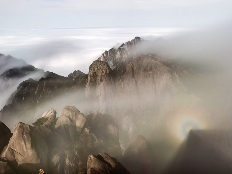 冬季來黃山,除了壯闊波瀾的雲海,琉璃仙境般的冬景,最讓人驚喜的便是那罕見的“佛光”奇景。