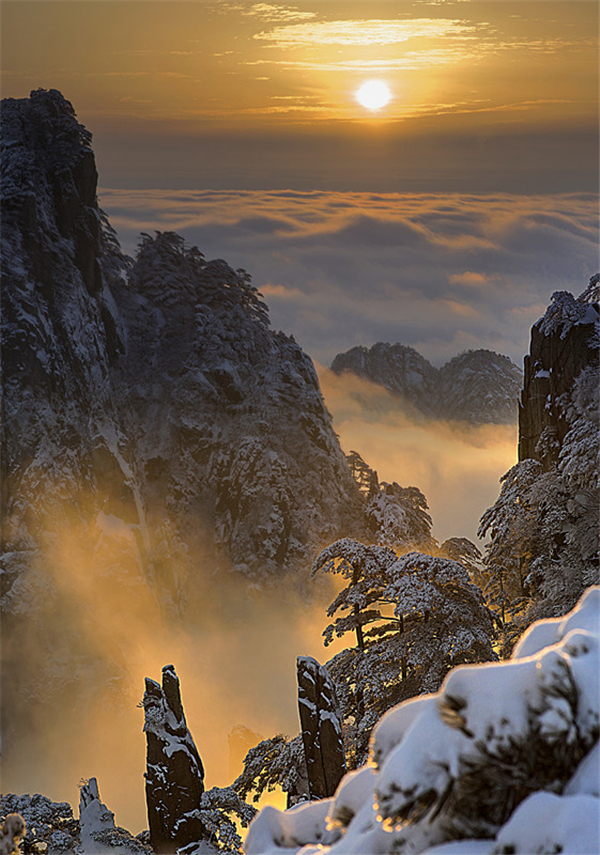 黃山四季皆勝景,唯有臘冬景更佳。在漫天飛雪的冬季,五百里黃山千溝萬壑銀裝素裹,宛如瑤臺仙境。冬季遊黃山,嬉冬雪、觀霧凇、覽雲海、賞日出夕陽、遇佛光,每一件都是你不能錯過的美好。