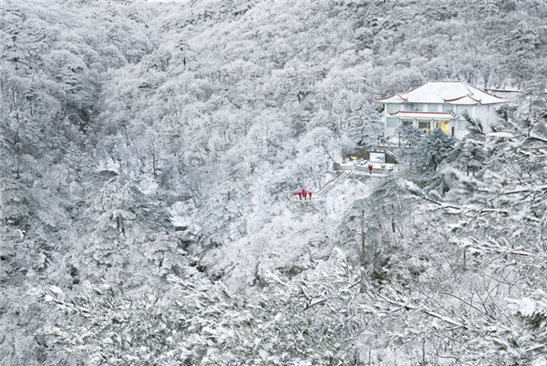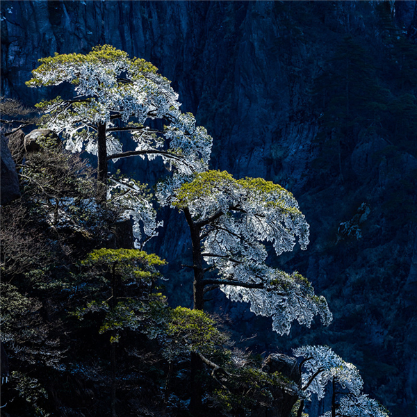 觀霧凇,冬天的黃山,那漫山的松、遍地的灌木,都成為銀花盛開的玉樹,仿佛冰塑;山巒、怪石之上,茫茫一片,似雪非雪,仿佛披上一層晶瑩的外衣,光彩照人,在燦爛的陽光下,閃爍生輝,蔚為壯觀。