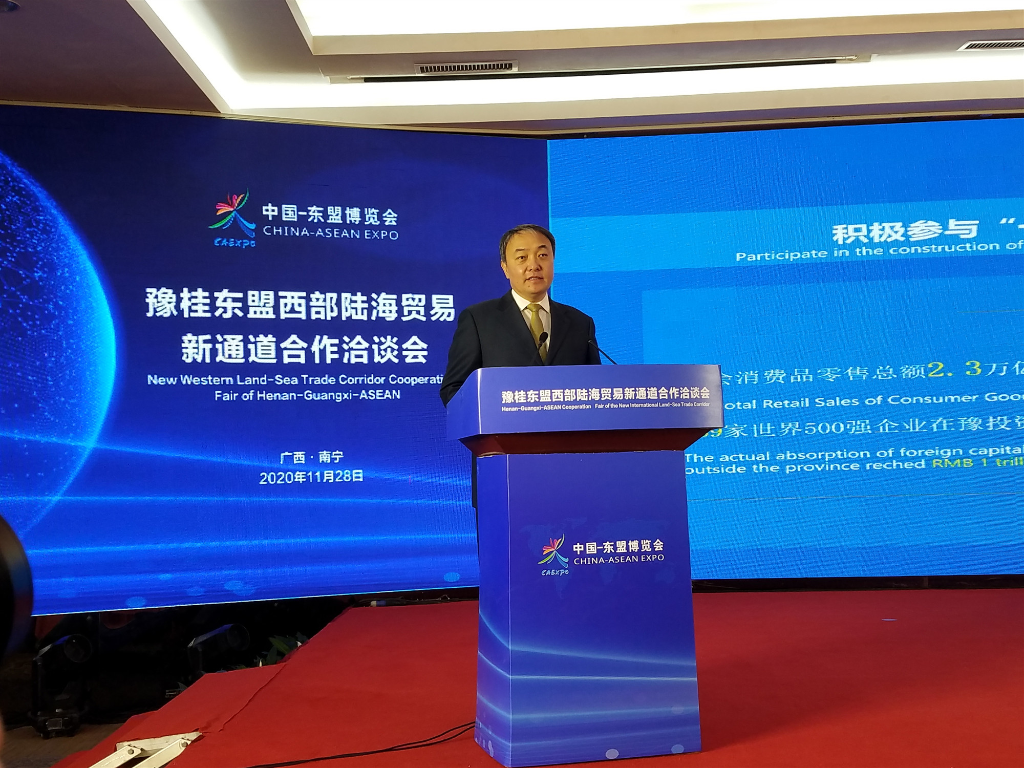河南省商務廳廳長馬健致辭並推介豫桂東盟開放合作優勢。據介紹,東盟是河南省第二大貿易夥伴,2019年進出口貿易達到108.1億美元,同比增長20%,佔全省的13.1%。今年前10個月,河南對東盟進出口增長3.2%,東盟在河南新設外資企業11家,實際利用東盟資金11億美元,新加坡豐益國際、泰國正大等東盟國家企業在河南投資發展態勢良好。