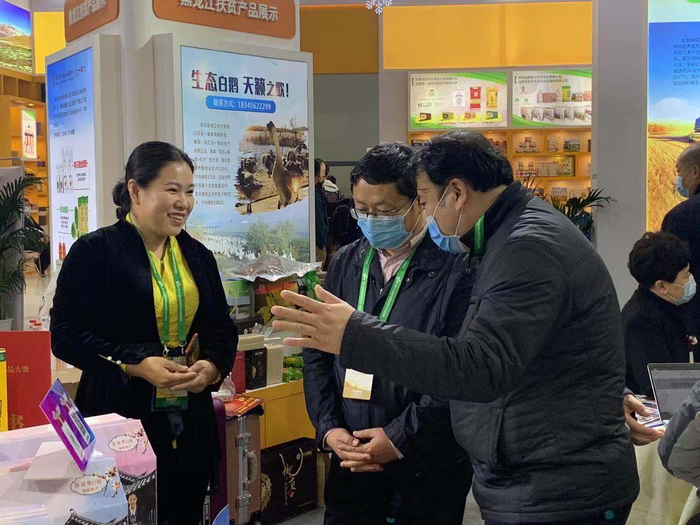 哈爾濱健康農牧業有限公司董事長孫立娟(左一)向黑龍江省農業農村廳二級巡視員顧毅(右二)介紹產品