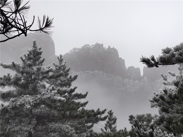 霧凇是黃山冬季的天然奇景,當氣溫下降到0℃以下,有霧或毛毛雨天氣時,樹木、石塊等物體附著的凍結物,氣象學上稱為霧凇。黃山高海拔景區平均每年有霧凇62.9天,一般集中在11月下旬到次年的3月上旬。
