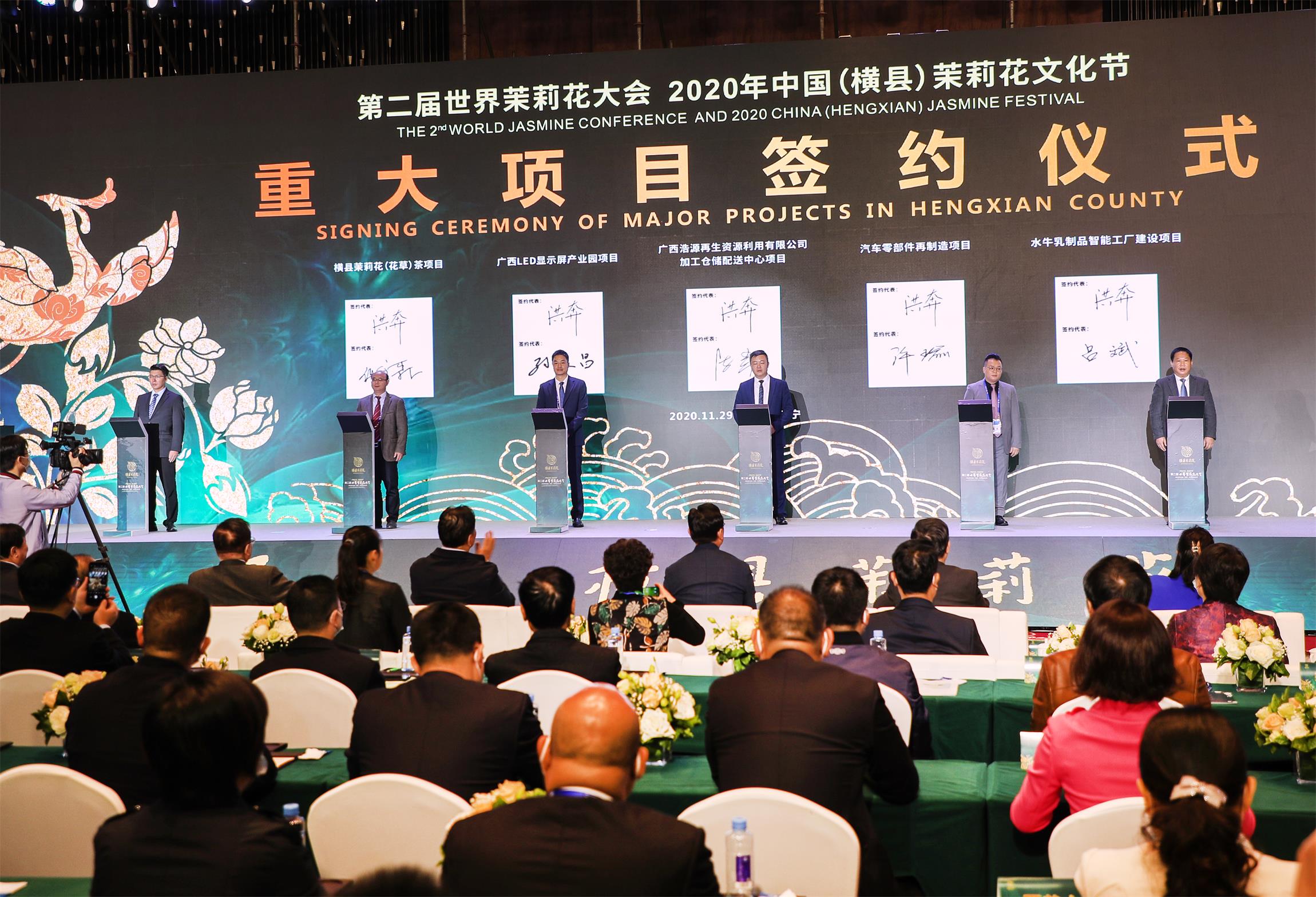 第17屆東博會期間,橫縣以花為媒,成功簽約8個項目,總投資額26.93億元。包括總投資19.6億元的廣西浩源再生資源利用有限公司廢鋼鐵加工倉儲配送中心項目暨廣西德源冶金有限公司搬遷技改項目,東莞市金英啟航精密科技有限公司投資1.5億元的廣西LED顯示屏產業園項目,福建春倫集團有限公司投資1.2億元的橫縣茉莉花(花草)茶項目等。8個項目建成達產後,預計年銷售收入約141.65億元,年納稅約5.49億元。
