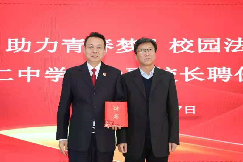 為深入貫徹中央全面依法治國工作會議上習近平總書記「要加強青少年法治教育,不斷提升全體公民法治意識和法治素養。」的重要指示精神,把張軍檢察長「擔任法治副校長是落實習近平法治思想的一項重要舉措,給孩子們上好法治課,就是建設中國法治的未來!」重要講話精神落實到檢察工作實踐中。哈爾濱市道外區人民檢察院第七檢察部積極開展工作,新一任黨組成員「法治副校長」聘任工作全部完成,「普法進校園」工作有序開展,2020年11月27日,該院黨組書記、檢察長仲昭祥在哈爾濱市第十二中學在該校校長李穎健及部分師生的見證下,從道外區教育局局長於繼洲手中接過聘書,正式受聘為哈爾濱市第十二中學法治副校長。