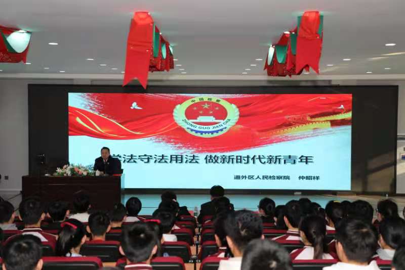 聘任儀式後,仲昭祥檢察長以《學法守法用法 做新時代新青年》為題,為該校百餘名高一學生帶來了一堂結合「政史地」,傳遞「愛國主義思想」的法治課,這是該院「檢察藍助力青春夢」校園法治巡講的新接力,也是「普法進校園」工作的新征程。授課中,仲昭祥檢察長結合高一學生思想學習實際,從「法」的含義出發,將古今中外法律的發展演變與歷史、地理相結合,講述了知法守法的重要性;以法律與道德的關係,講述守法與養成良好習慣、遵規守紀對青年成長的重要意義;引領學生回望歷史沿革、科技發展,增強學生的民族認同感、自豪感,激勵學生努力學習,為新時代發現貢獻新的青年力量。仲昭祥檢察長的授課引經據典、深入淺出,現場氣氛活躍,互動頻繁,受到於際洲局長和李穎健校長的高度評價,也贏得了師生肯定的掌聲。