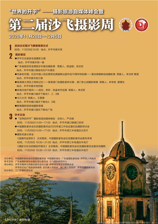 11月29日「世界的開平」——攝影旅遊自媒體峰會暨第二屆沙飛攝影周在廣東開平市拉開帷幕。活動旨在通過影像展覽、學術交流、名家分享、攝影採風等活動,發揮影像力量,提升世界文化遺產「開平碉樓與村落」的核心品牌競爭力,加快開平市全域旅遊發展,追尋南粵大地以沙飛為代表的紅色攝影先驅們的足跡,鼓勵廣大文藝工作者和攝影家堅定文化自信,探討社會紀實攝影在新常態下的新路徑、新走向。