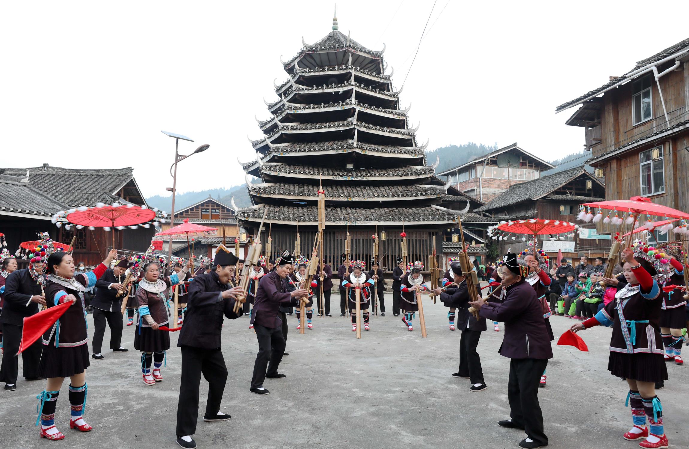 侗族群眾在表演蘆笙踩堂