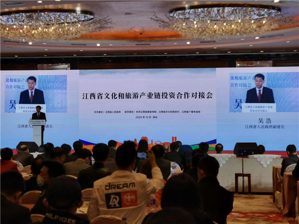 江西省副省长吴浩在文化和旅游产业链投资合作对接会上致辞。