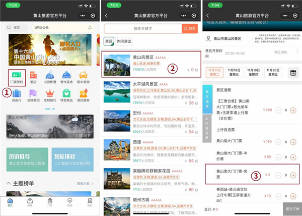1. 完成線上預約選擇遊覽黃山風景區的股東,需先登錄“黃山旅遊官方平臺”,點擊“門票預約”選擇黃山風景區,進入預訂介面後選擇“南大門或北大門下方的預訂入口”,選取遊覽的日期並選擇“門票-免票”選項,最終完成預約。(溫馨提示:活動期間玉屏索道因設備年度檢修暫停運營)