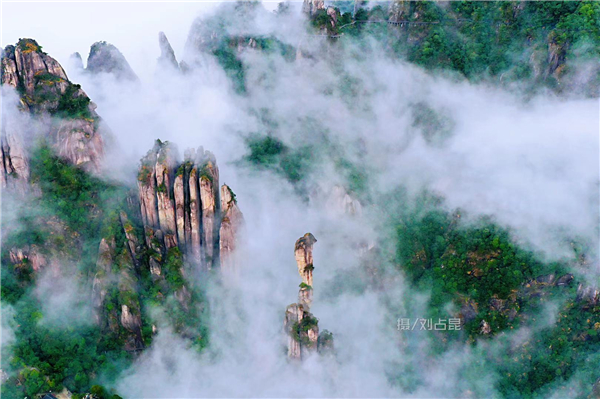不到靈山,不知其“靈”。靈山屬於世界罕見的環狀花崗岩峰林地貌,素有“奇石海洋”之稱,曾有驢友穿越靈山后歎為“巨龍肩膀上的行走”。上山后,雲霧漸起,媒體團成員沿著游步道和棧道行於峻拔山間,近處“狸貓盜仙草”、“老漢藏錢”、“鬱悶猴王”等一處處奇石景觀意趣非常,遠處則疊嶂含煙,可謂“處處奇峰,山山有靈”!導遊介紹說靈山有72峰、36瀑、99宮、108處景點、400多處景觀景物,更是道、佛、儒三教聖地,歷史上名列道教三十三福地。雲霧中賞景,清新濕潤的空氣仿佛給鼻子和肺部來了個大護理,團中的女同胞更笑言“今天做了個純天然富氧保濕面膜”。