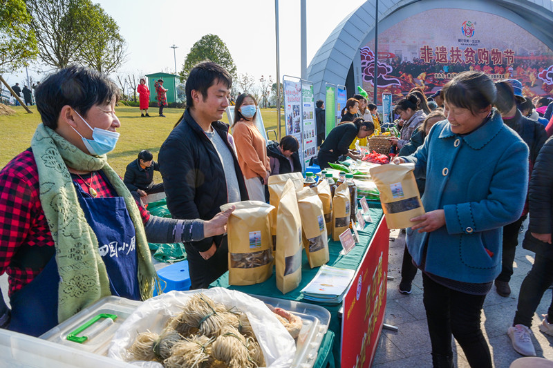 碧空如洗,陽光溫潤。12月5-6日,在黃山腳下、浦溪河畔的安徽黃山市黃山區非遺扶貧購物節的現場,人頭攢動、熱鬧非凡。40餘個展臺前陳列著桑葚酒、葛根、黃花菜、香榧、茶葉等120餘種黃山區非遺產品和年貨土特產品,吸引著眾多市民遊客駐足諮詢購買。