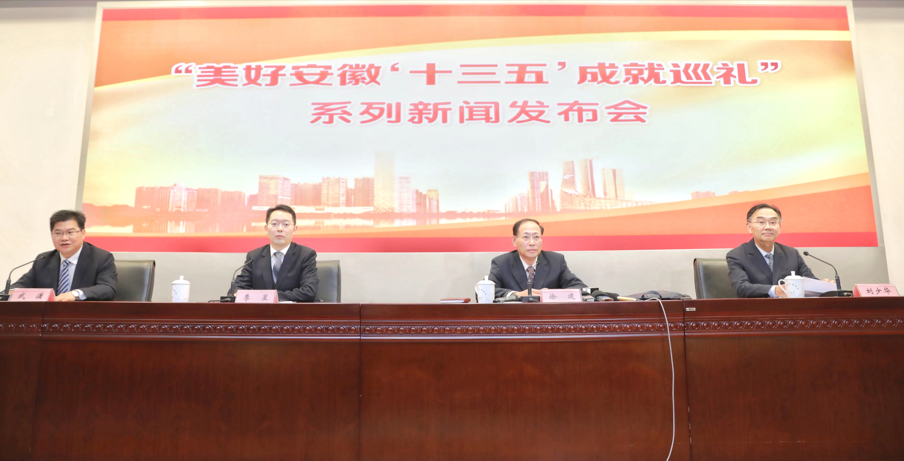 「美好安徽『十三五』成就巡禮」系列新聞發佈會(第十三場),左起:安徽省委宣傳部新聞發佈處處長武瀟主持發佈會,省人力資源社會保障廳副廳長季星,省委組織部副部長(兼)、省人力資源社會保障廳廳長徐建,省人力資源社會保障廳副廳長劉少華先後介紹相關情況並回答記者提問