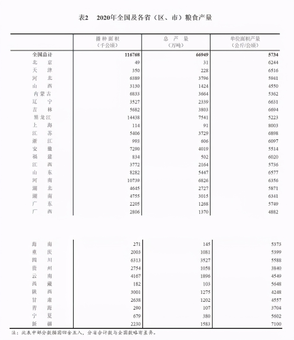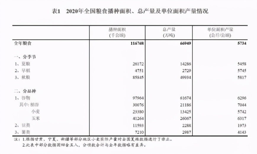 根據對全國31個省(區、市)的抽樣調查和農業生產經營單位的全面統計,2020年全國糧食播種面積、單位面積產量、總產量如下: