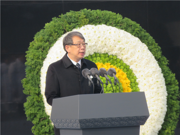 陳希發表講話。他表示,今天,我們在這裏隆重集會,深切緬懷南京大屠殺無辜死難者,緬懷所有慘遭日本侵略者殺戮的死難同胞,緬懷為中國人民抗日戰爭勝利獻出生命的革命先烈和民族英雄,緬懷同中國人民攜手抗擊日本侵略者獻出生命的國際戰士和國際友人,宣示中國人民銘記歷史、不忘過去,珍愛和平、開創未來的莊嚴立場,表達堅定不移走和平發展道路的崇高願望。