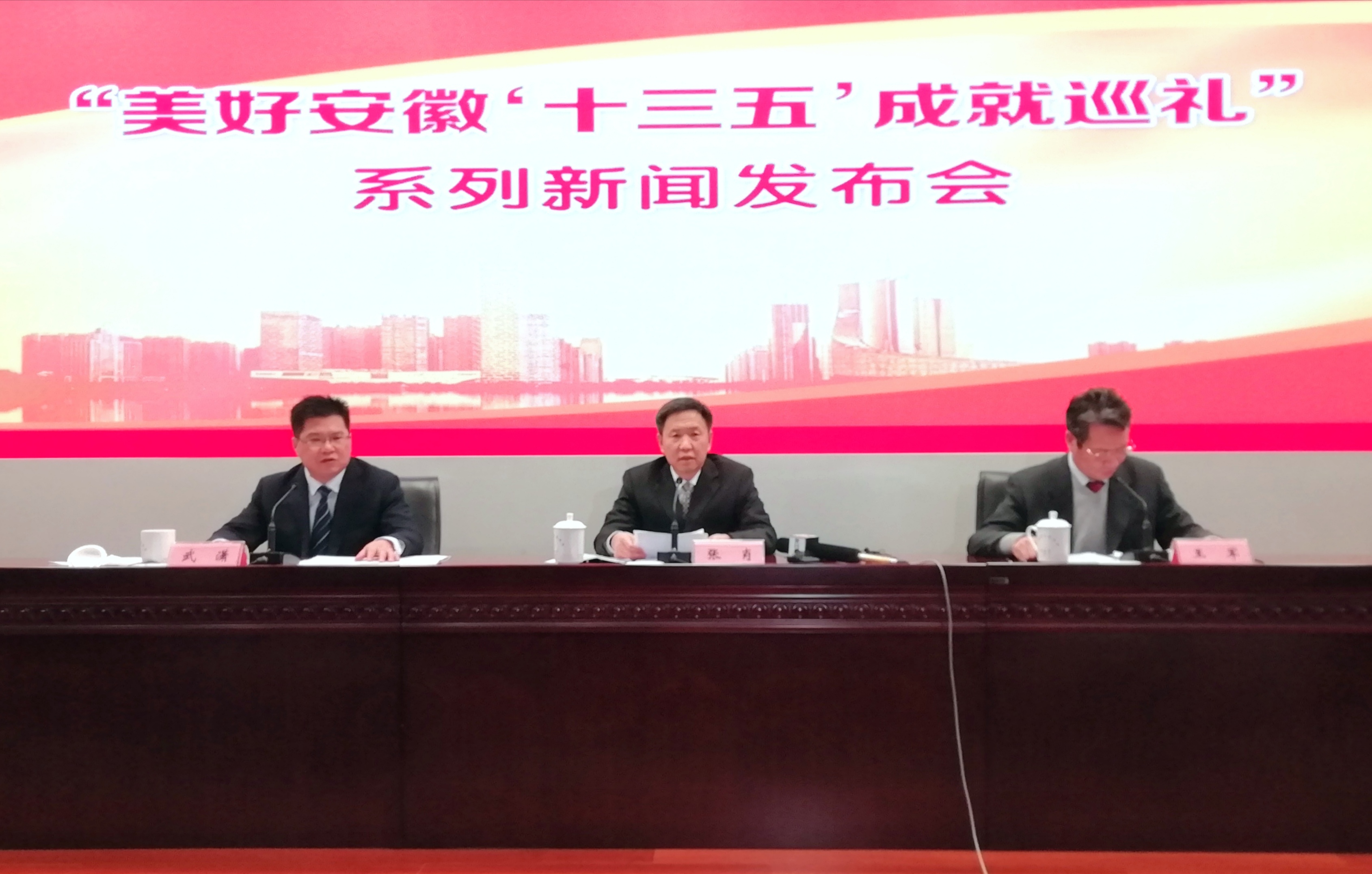 安徽省委宣傳部新聞發佈處處長武瀟主持發佈會(左),省水利廳廳長張肖、省水利廳總工程師王軍先後介紹相關情況並回答記者提問(孫軍/攝)