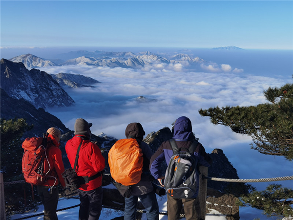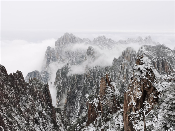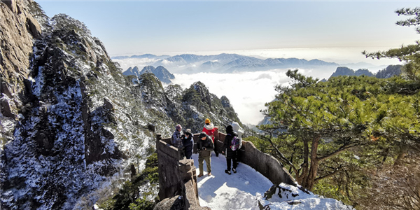 雲海、冬雪皆在黃山“五絕”之列,兩種景觀一齊出現為冬日黃山增色不少。聳峙的山峰覆蓋著深淺不一的白雪,更添凜冽的威嚴。山上的雪順著千松萬石次第鋪開,陽光下張揚著黑與白的碰撞,一幅水墨中國畫躍然眼前。山腰的雲海氤氳湧動,連接著高山與天際,將整個黃山裝扮成蓬萊仙境。