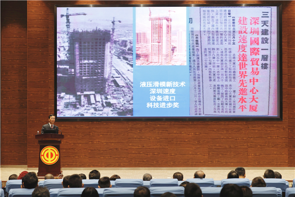 陸建新分享了自己的成長曆程:現年55歲的陸建新是中建科工集團有限公司華南大區總工程師,自1982年來到深圳投身建設事業以來,他從最基層測量員做起,輾轉工作於國內外多座城市,參與了深圳國貿大廈、地王大廈、平安國際金融中心等46項工程施工,創造了「三天一層樓」的「深圳速度」,參建工程總高度達3600餘米,被譽為「中國摩天大樓第一人」。