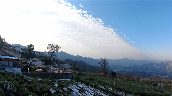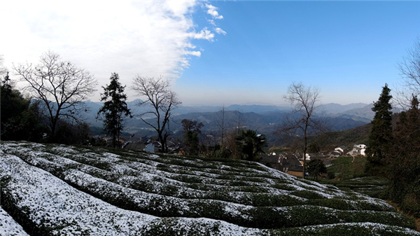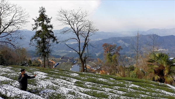 安徽省黃山市休寧縣藍田鎮的金龍山村是一個高山村落。12月16日,金龍山雪後初晴,古樸的民居、翠綠的茶園在殘雪的映襯下格外美麗。