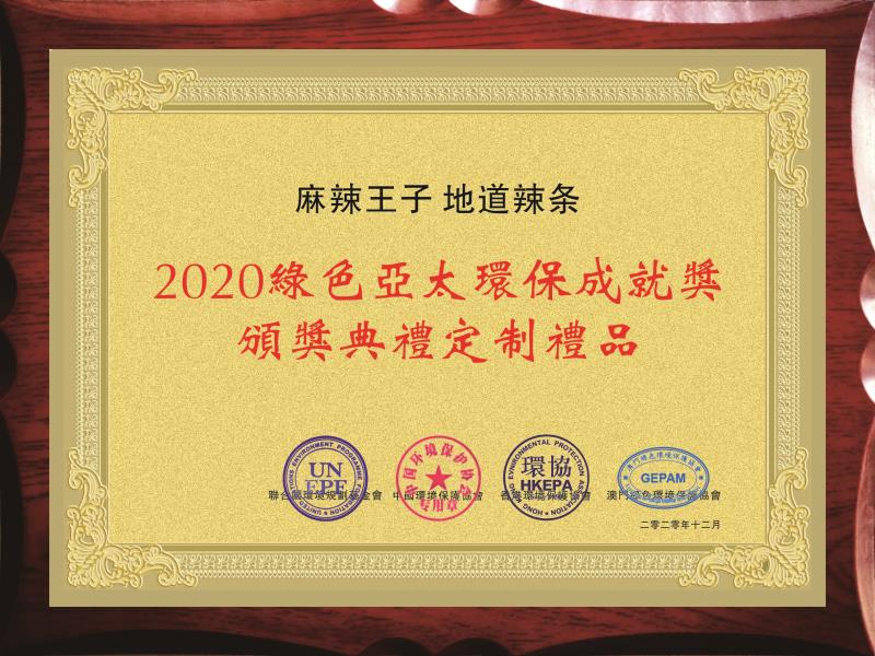 「2020綠色亞太環保成就獎」頒獎典禮12月18日晚在深圳舉行,共頒出16項大獎。「麻辣王子,地道辣條」成2020綠色亞太環保成就獎頒獎典禮定製禮品。據了解,「2020綠色亞太環保成就獎」由聯合國環境規劃基金會、中國環境保護協會、香港環境保護協會、澳門綠色環境保護協會聯合主辦,媒體主辦方為全球商報聯盟、香港商報。支持機構有香港中華總商會、香港中華廠商聯合會、香港工業總會,並得到內地、香港數十個地方政府、企業、商會和環保組織機構的支持。