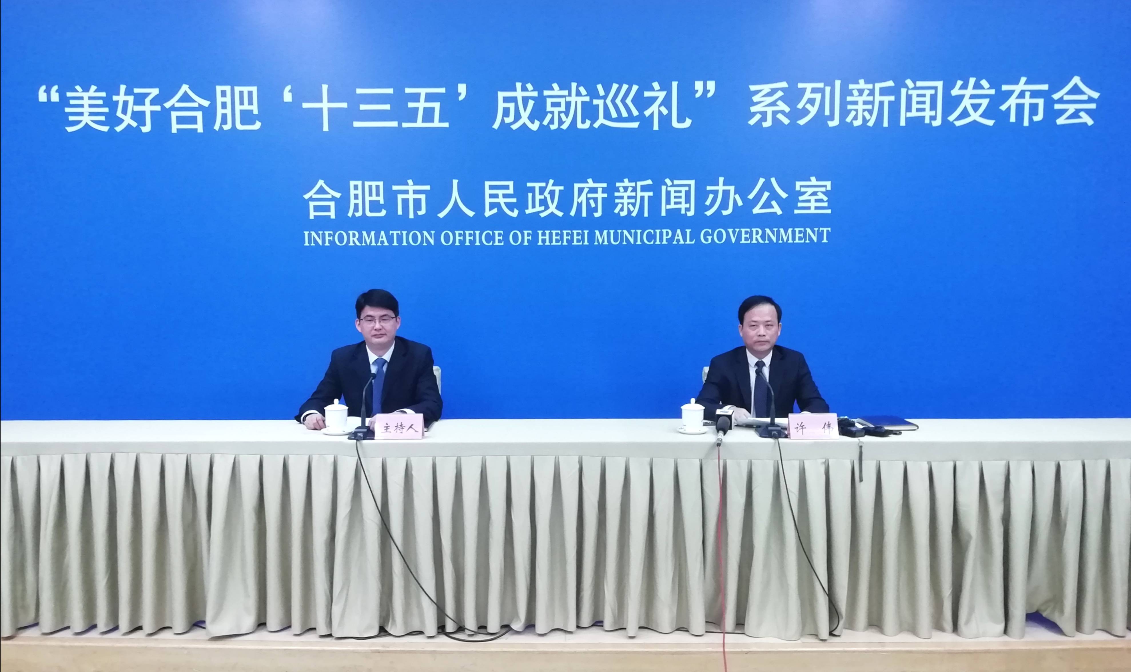 「美好合肥『十三五』成就巡禮」系列新聞發佈會第一場,合肥市委宣傳部外宣辦主任趙明錄(左)主持發佈會,市發改委總工程師許偉介紹相關情況(孫軍/攝)