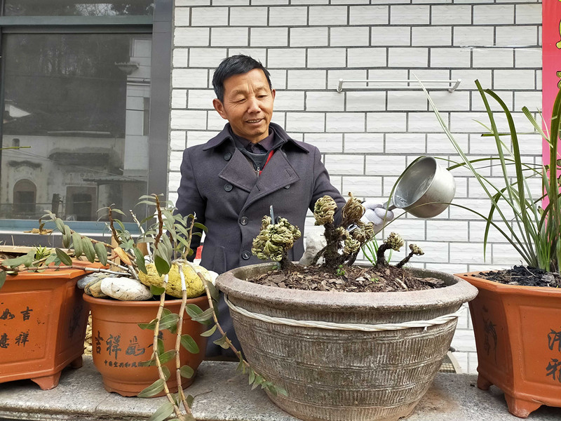 12月21日,安徽黃山市休寧縣渭橋鄉渠口村裏渠口村民組脫貧戶汪金全,正樂呵呵的自家門前製作紫薇樹的盆景,借著脫貧攻堅的春風,他家的生活現在過得有滋有味。