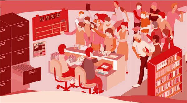 以金色與紅色為主色調的插畫代表深圳這座城市以及金融證券行業的蓬勃發展與不斷進取