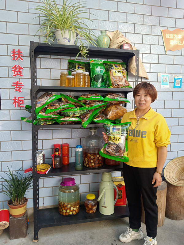 在自己致富的同時,她沒有忘記為鄉親們做些實實在在的事情。家中庭院內,“扶貧專櫃”四個大字赫然立在牆上。原來,為幫助解決村中農產品銷路不多的問題,她四處奔走,從村中收集幹豆角、幹筍、苞蘆松等農家土特產,為大家代賣。去年入冬以來,代賣野生獼猴桃、土蜂蜜、辣椒醬、醃辣椒、苞蘆松、幹筍等收入5000餘元,幫助貧困戶3戶增收1000餘元。