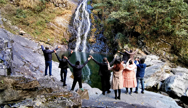 一場冬雨後,瀑布水勢增大,從高處直沖而下,氣勢壯觀,引來一撥又一撥打卡的遊客。