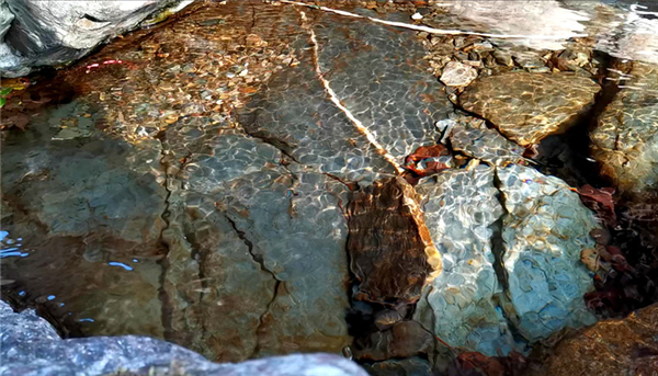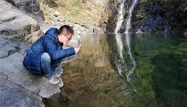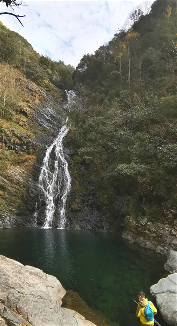 沿著山間小徑,徒步走到龍井潭瀑布,只見瀑布伴著轟鳴之聲飛瀉而下,沖入深潭,濺起無數浪花。瀑布下方的水潭,碧波微微蕩漾,宛如一塊天然的巨大翡翠。潭水純天然、無污染,令人忍不住掬一捧入口。