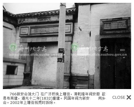 蘇州閶門外大道上有座廣濟橋,橋下就是上塘街,離橋墩不遠處有幢石庫門的房子,門上方刻著“新安會館”四個大字,內有一個組織“徽州旅蘇同鄉會”,有辦事人員,還有一些個體戶及其家屬也住在裏面。