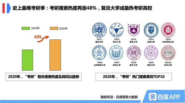 百度搜索大數據顯示,2020年「考研」相關內容搜索熱度整體同比上漲48%。在考研學校的選擇上,除了學校排名,考生同時開始關注學校所在的地理位置,南方高校搜索熱度超過北方,一線及新一線城市院校關注度更高,復旦大學、浙江大學、南京大學成為今年廣大考研學子熱搜高校前三名。