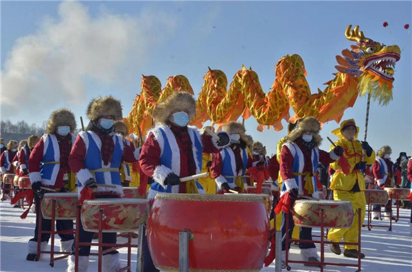 上午9時許,美麗的永安東湖風景區內彩旗招展,人聲鼎沸,大家滿懷熱情期待着盛會的開啟。此時,一陣美妙的歌聲從冰封的湖面上傳來,只見兩位身着節日盛裝的演員乘坐裝飾一新的雪地車緩緩駛來,一曲《美麗嘉蔭等你來》唱得熱情奔放,令人深深陶醉。隨後,80面大鼓同時擂響,激昂的鼓點聲震九霄,3條威風凜凜的彩色長龍,穿梭飛舞,氣勢如虹,一派龍騰盛世、鼓舞歡歌的祥和景象。