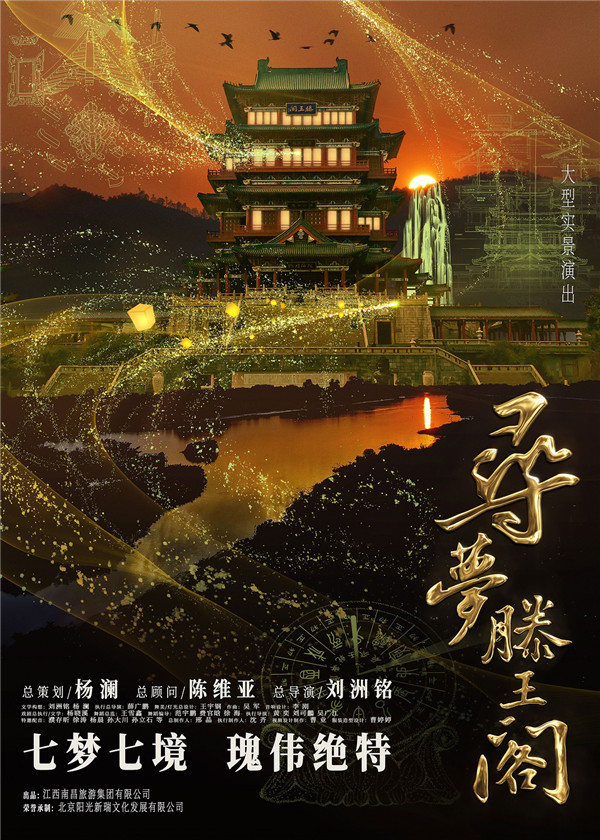 總導演劉洲銘介紹:“《尋夢滕王閣》演出分為三個部分,閣體一小時內的演出,以及行走沉浸式的環廊《詩詞之路》互動,和第三空間的戲臺的《滕王畫蝶》。運用當下最前沿的舞美燈光科技,集話劇、舞蹈、多媒體視覺藝術於一體。在創作中我們研究滕王閣建築的明三暗七的結構。明三閣,上為天格,下為地格,中間所蘊人格,暗七格對應人生境遇,《尋夢滕王閣》就是尋夢人生的七境。我們‘以閣立境,以閣尋真’,在《尋夢滕王閣》中呈現另一番瑰偉絕特。”