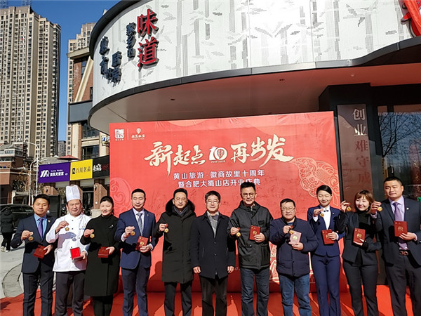 當天,徽商故里大蜀山店正式開業。簡短的啟幕儀式上,黃山旅遊發展股份有限公司黨委書記、董事長章德輝,黨委副書記、紀委書記裴斌與徽商故里管理團隊一起許下美好祝願。