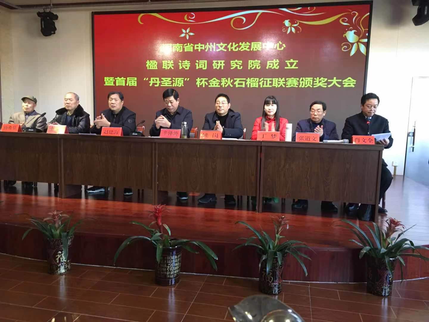「年末歲尾逢盛事,楹聯學界得佳音」。12月30日,河南省中州文化發展中心楹聯詩詞研究院成立暨首屆「丹聖源」杯金秋石榴征聯賽頒獎大會在南水北調中線渠首南陽市淅川縣召開,來自全省楹聯詩詞界100餘人參加了本次大會。