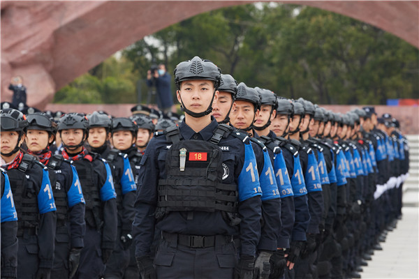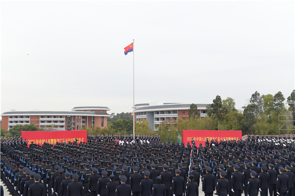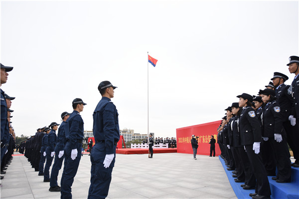 1月10日是首個中國人民警察節,廣東省公安廳在廣東公安英雄廣場隆重舉行升警旗儀式。當天上午10時,神聖莊嚴的升警旗儀式在全場齊聲奏唱《中華人民共和國國歌》聲中拉開序幕,40名警旗護衛隊員英姿颯爽、氣宇軒昂,他們組成護旗方陣,邁着鏗鏘有力、整齊劃一的步伐,沿着廣東公安英雄廣場中軸線將警旗護送至升旗台。儀式現場奏響《中國人民警察警歌》,承載着榮譽和使命的警旗在激昂雄壯、催人奮進的歌聲中冉冉升起。來自廣東公安廳機關副處級以上領導幹部和民警代表,廣東公安實戰大練兵特警代表、廣東公安警務實戰教官特訓營教官代表,廣州、佛山市公安局民警輔警代表共1000人參加儀式。(記者 黃裕勇)